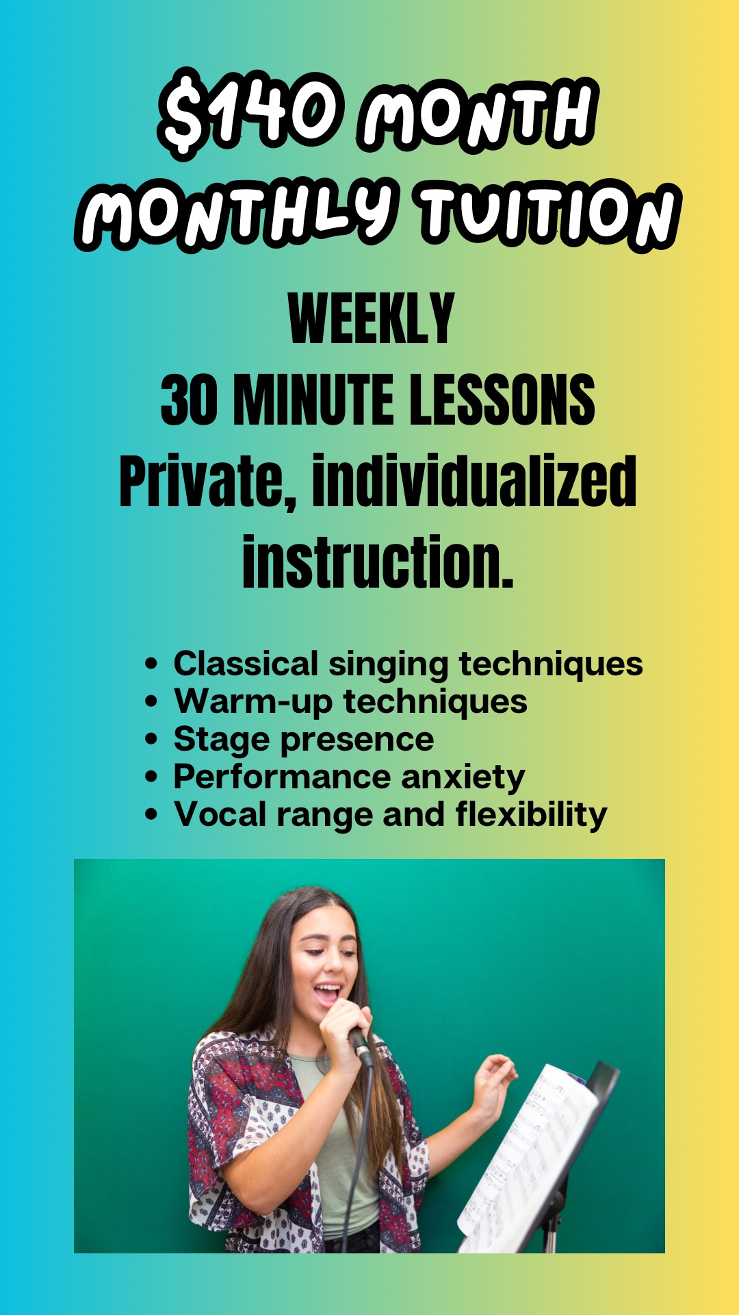 Materials: Vocal music books and sheet music appropriate for age and skill level are used.  Other materials such as karaoke tracks, flash cards, music games, apps, practice reward incentives, and prizes are all utilized to engage the students and make learning fun!